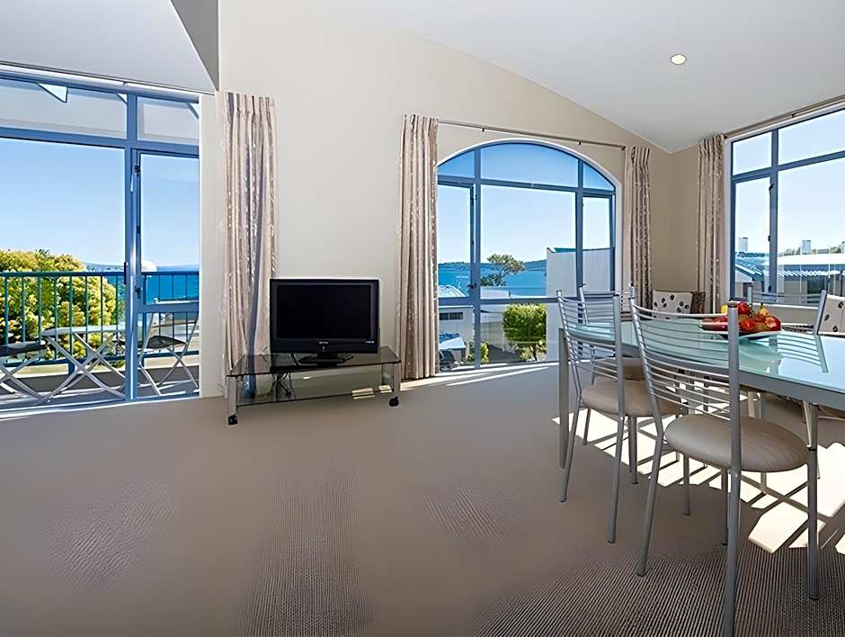 Located on the upper level, this spa studio features spectacular views across Lake Taupo and the surrounding Central Plateau Mountain Range. It features a large 2-person spa bath, a modern living room, 51+ cable channels with Guest Select, air-conditioning, and a private balcony overlooking the lake.